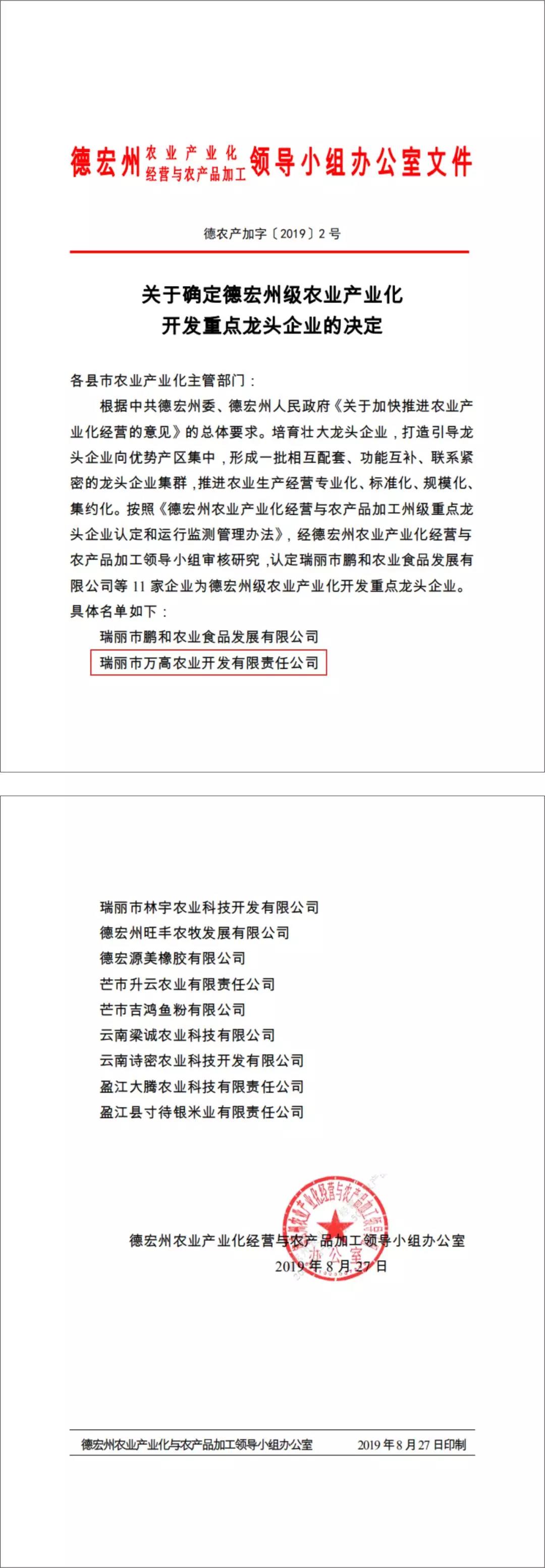 2019年8月27日,經(jīng)德宏州農(nóng)業(yè)產(chǎn)業(yè)化經(jīng)營與農(nóng)產(chǎn)品加工領(lǐng)導(dǎo)小組審核研究,認(rèn)定瑞麗市萬高農(nóng)業(yè)開發(fā)有限責(zé)任公司為德宏州級農(nóng)業(yè)產(chǎn)業(yè)化開發(fā)重點(diǎn)龍頭企業(yè)。