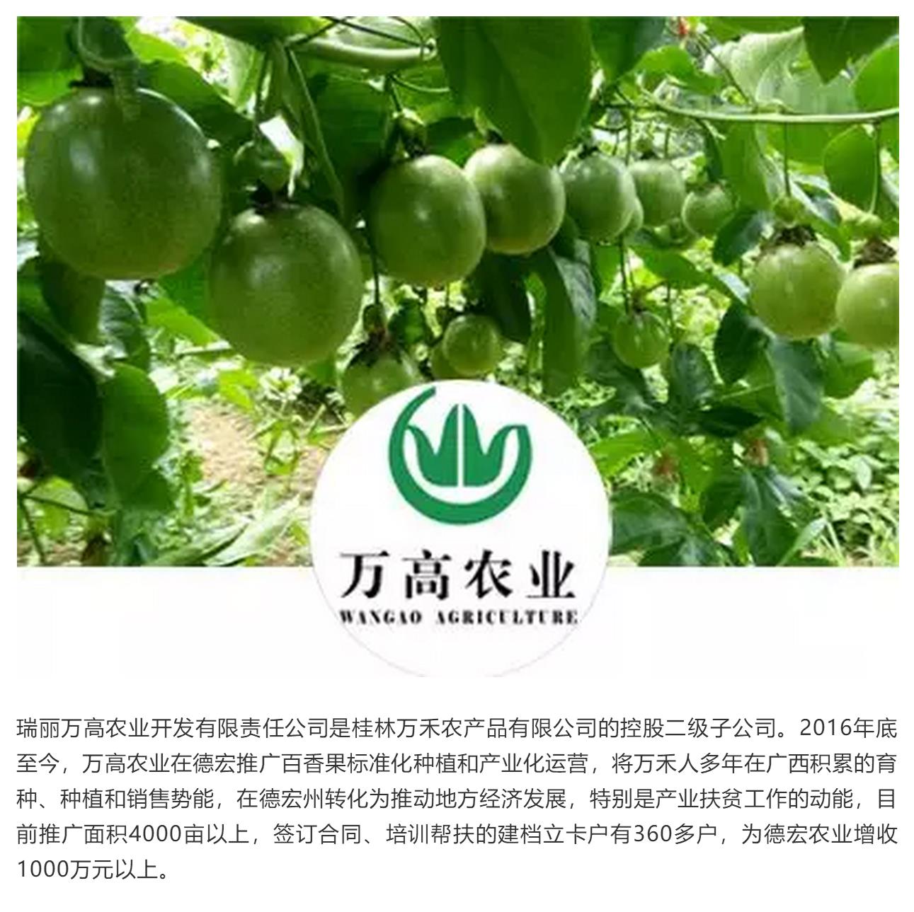 德宏州發(fā)展百香果具有得天獨(dú)厚的優(yōu)勢(shì),萬(wàn)禾公司通過(guò)三年在戶撒鄉(xiāng)發(fā)展百香果種植,戶撒鄉(xiāng)產(chǎn)的百香果具有個(gè)體大、品質(zhì)優(yōu)、病菌危害少的特點(diǎn),是發(fā)展百香果產(chǎn)業(yè)的最佳區(qū)域。通過(guò)建設(shè)戶撒百香果種苗繁育及種植示范園區(qū)進(jìn)一步探索百香果高海拔種植技術(shù),為全州百香果發(fā)展提供優(yōu)質(zhì)種苗、把百香果產(chǎn)業(yè)打造成德宏高原特色農(nóng)業(yè)的一張靚麗名片奠定基礎(chǔ)。