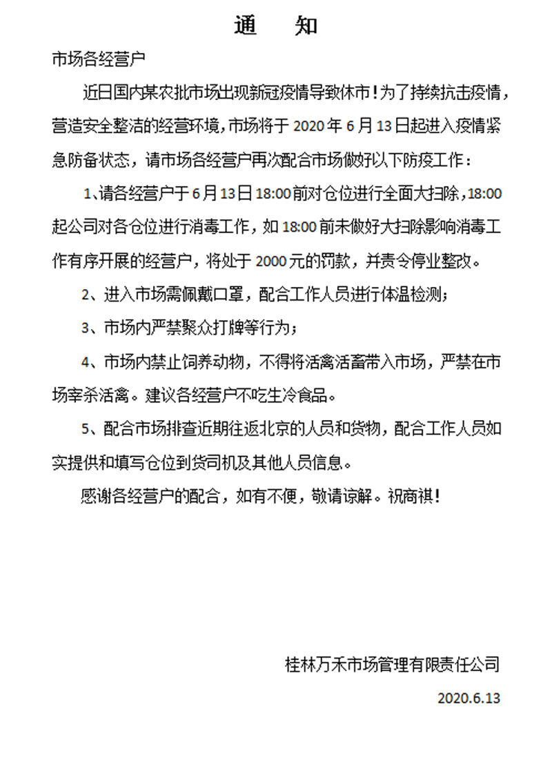 近日,國(guó)內(nèi)某農(nóng)批市場(chǎng)出現(xiàn)新冠疫情導(dǎo)致休市。為了持續(xù)抗擊疫情,營(yíng)造安全整潔的經(jīng)營(yíng)環(huán)境,萬(wàn)禾市場(chǎng)迅速行動(dòng),召開(kāi)緊急防疫工作布置會(huì)議。于2020年6月13日發(fā)布緊急通知,宣布入疫情緊急防備狀態(tài),并對(duì)市場(chǎng)倉(cāng)位進(jìn)行全面消殺,排查進(jìn)出車輛及貨物等多項(xiàng)針對(duì)性的措施,堅(jiān)決遏制疫情的蔓延勢(shì)頭。