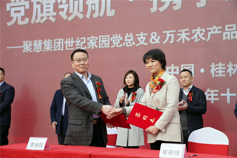 ▲黨旗領(lǐng)航·攜手助力鄉(xiāng)村  振興聚慧集團(tuán)世紀(jì)家園黨總支與桂林萬(wàn)禾農(nóng)產(chǎn)品有限公司黨總支黨建共建簽約儀式