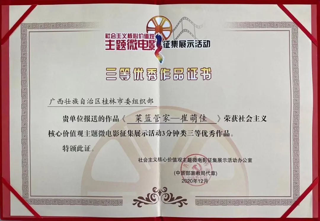 桂林市委組織部報(bào)送的《菜籃管家—崔萌佳》榮獲第四屆社會主義核心價(jià)值觀主題微電影(微視頻)征集展播活動3分鐘類三等優(yōu)秀作品啦!