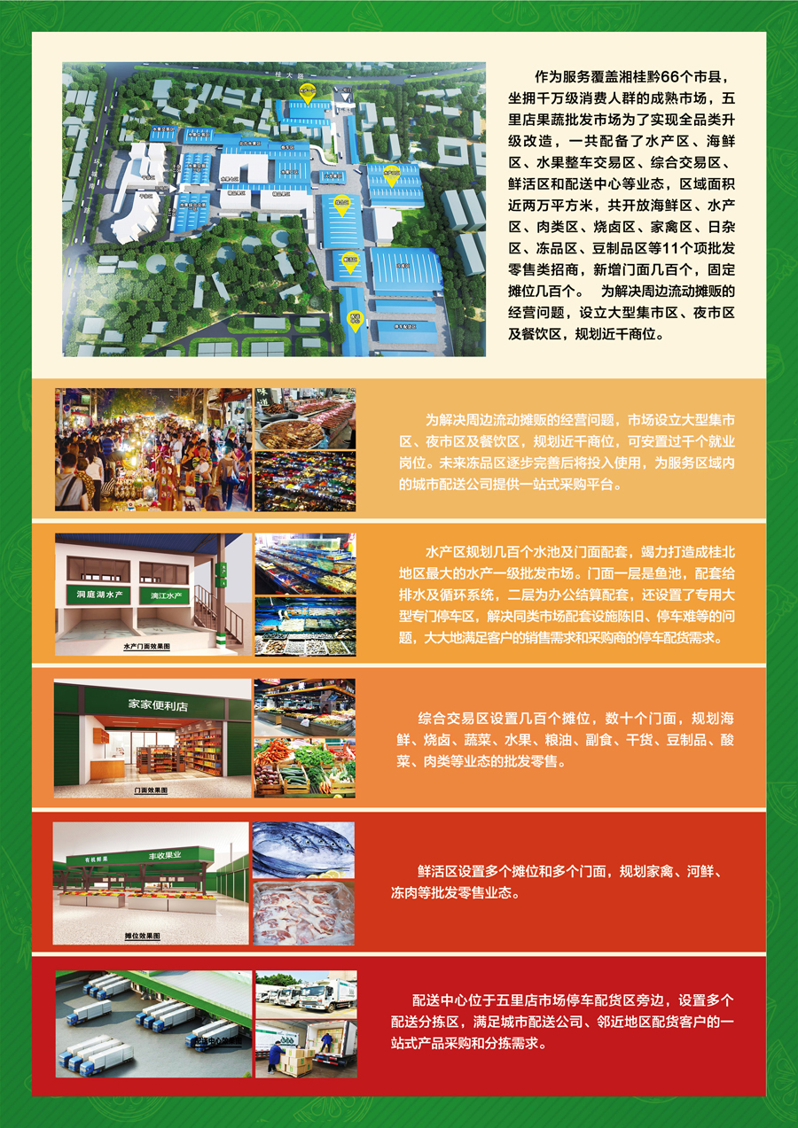 作為服務(wù)覆蓋湘桂黔66個(gè)市縣,坐擁千萬級(jí)消費(fèi)人群的成熟市場(chǎng),五里店果蔬批發(fā)市場(chǎng)為了實(shí)現(xiàn)全品類升級(jí)改造,一共配備了水產(chǎn)區(qū)、海鮮區(qū)、水果整車交易區(qū)、綜合交易區(qū)、鮮活區(qū)和配送中心等業(yè)態(tài),區(qū)域面積近兩萬平方米,共開放海鮮區(qū)、水產(chǎn)區(qū)、肉類區(qū)、燒鹵區(qū)、家禽區(qū)、日雜區(qū)、凍品區(qū)、豆制品區(qū)等11個(gè)項(xiàng)批發(fā)零售類招商,新增門面幾百個(gè),固定攤位幾百個(gè)。為解決周邊流動(dòng)攤販的經(jīng)營(yíng)問題,設(shè)立大型集市區(qū)、夜市區(qū)及餐飲區(qū),規(guī)劃近千商位。