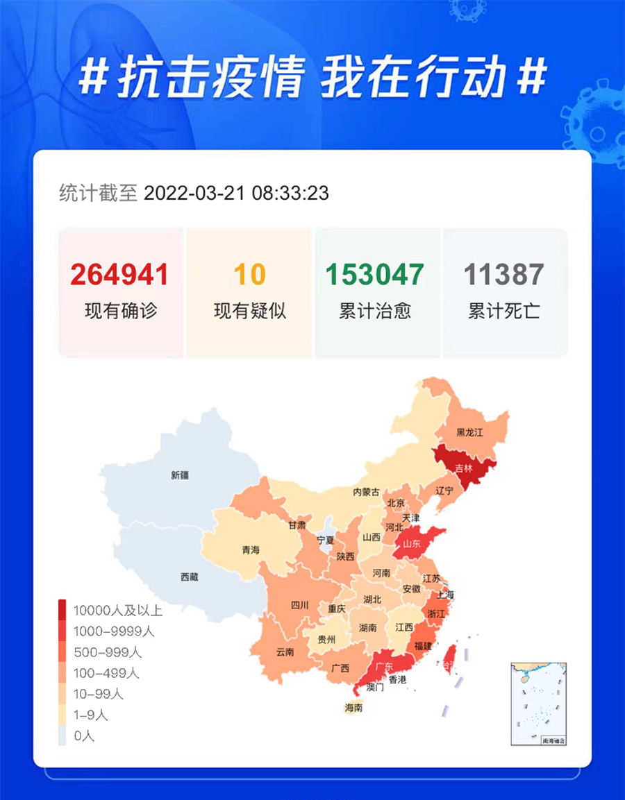 截至3月20日24時(shí),據(jù)31個(gè)省(自治區(qū)、直轄市)和新疆生產(chǎn)建設(shè)兵團(tuán)報(bào)告,現(xiàn)有確診病例21388例(其中重癥病例39例),累計(jì)治愈出院病例106200例,累計(jì)死亡病例4638例,累計(jì)報(bào)告確診病例132226例,現(xiàn)有疑似病例14例。累計(jì)追蹤到密切接觸者2053069人,尚在醫(yī)學(xué)觀察的密切接觸者336223人。