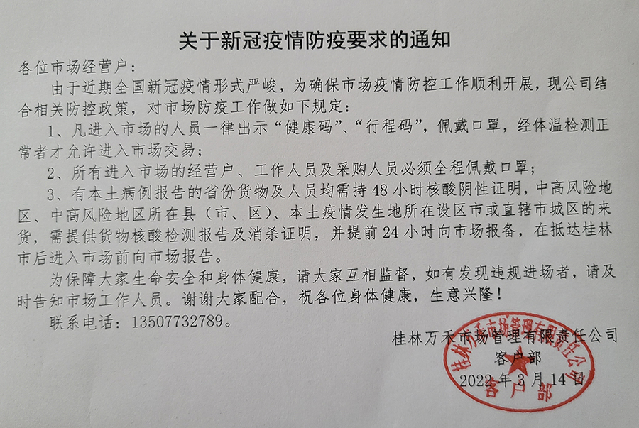 充分落實(shí)防控主體責(zé)任,對(duì)市場(chǎng)內(nèi)所有經(jīng)營(yíng)戶下發(fā)《關(guān)于新冠疫情防疫要求的通知》,制定相關(guān)工作人員及車輛出入的管控措施,加強(qiáng)對(duì)返桂來桂人員的排查管理,實(shí)時(shí)摸清市場(chǎng)疫情防控情況,做到全程可控。減少大型集聚性活動(dòng)舉辦的次數(shù)及規(guī)模,做好人數(shù)限制和有序引導(dǎo)分流等工作。