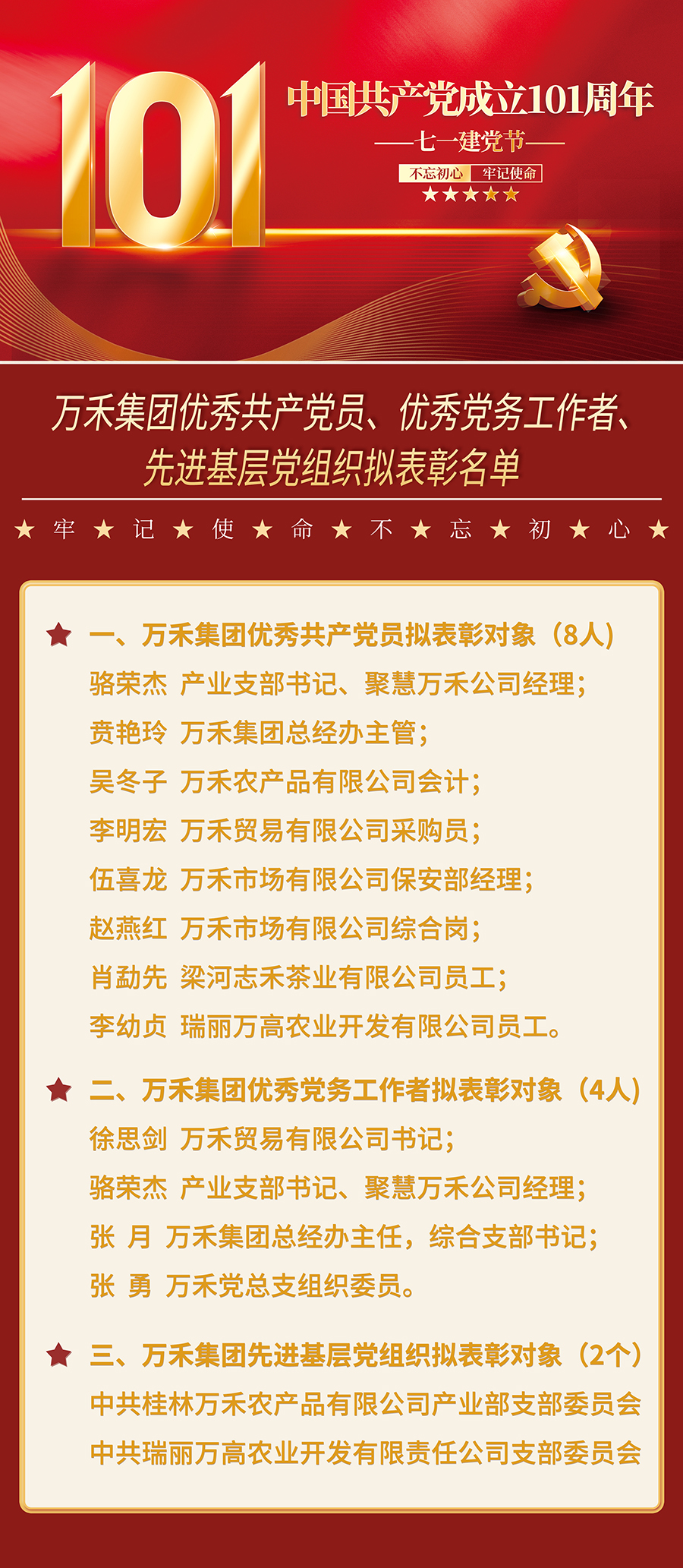 今年是中國(guó)共產(chǎn)黨成立101周年。黨總支決定,表彰一批公司優(yōu)秀共產(chǎn)黨員、優(yōu)秀黨務(wù)工作者和先進(jìn)基層黨組織。根據(jù)評(píng)選表彰工作部署,在公司各支部提出推薦對(duì)象的基礎(chǔ)上,經(jīng)認(rèn)真審核、遴選審議,確定了駱榮杰等8名同志為公司優(yōu)秀共產(chǎn)黨員、徐思劍等4名同志為公司優(yōu)秀黨務(wù)工作者、中共桂林萬禾農(nóng)產(chǎn)品有限公司產(chǎn)業(yè)部支部委員會(huì)2個(gè)基層黨組織為公司先進(jìn)基層黨組織擬表彰對(duì)象。